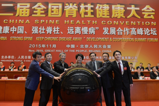 为认真贯彻国家十八大五中全会会议精神,积极响应十三五规划的"健康中国"国家战略,2015年11月21日下午,第二届全国脊柱健康大会暨“健康中国·强壮脊柱·远离慢病”合作发展高峰论坛在人民大会堂隆重召开。来自国家相关领导、院士、专家、专业学术团队、脊柱产业精英团队、全国脊柱健康事业者、志愿者、健康代表近7000人齐聚一堂,共同把脉中国健康服务产业发展及全球新机遇,分析慢病高发势态,挖掘脊柱健康根源,探讨慢性病防治康复科学方法和最新科技发展前沿。各大媒体争相报道,反响热烈,配合国家卫生监督及职能管理部门,建立一个遏制中国乃至世界慢性病发病率、改善慢性病、促进慢性病防治的长效机制,促进未来脊柱健康产业壮大和发展成为共识。