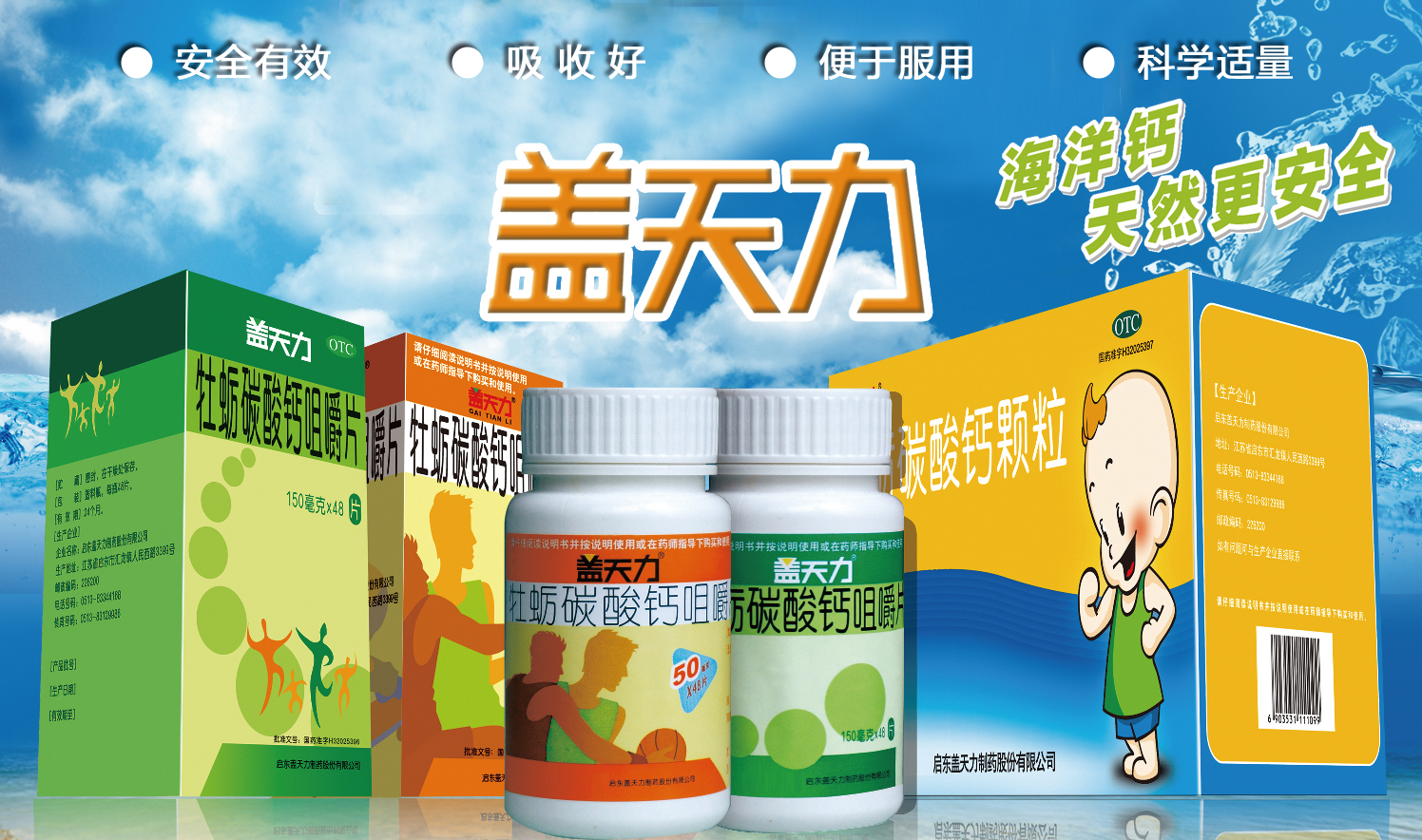 至今,盖天力已走过二十多年的历程,作为第一个唤醒国内补钙市场的品牌药品,始终坚持品质至上,坚持为国人提供高品质、高安全性的补钙产品。盖天力牡蛎碳酸钙是盖天力医药集团的主打产品,以天然海洋生物为原料,精选深海海底纯天然牡蛎制成,含钙量适中,包装规格和用法用量符合人体对钙的消化吸收生理机制,倡导少量多次科学补钙。该产品是针对有补钙需求的人群开发的。如中老年人、绝经妇女、孕妇、青少年等。正如产品上市之初所宣传的品牌主张一样,致力于让更多的人关注骨骼健康,科学补钙。