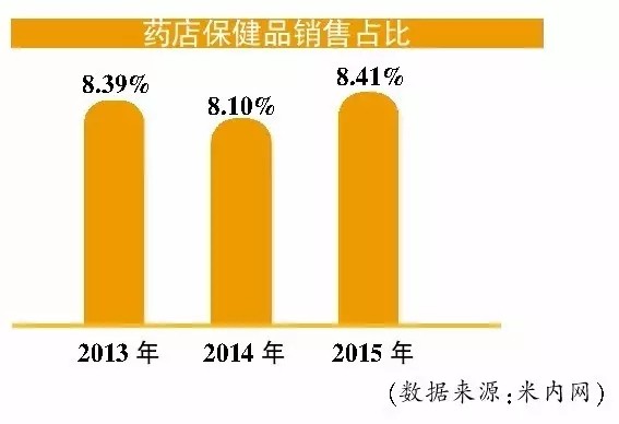 然而,据米内网零售监测系统的统计数据显示,2013年、2014年和2015年药店保健品的销售平均占比分别为8.39%、8.10%和8.41%。也就是说,在经历了2014年的低谷后,药店的保健品销售重新走上了增长的道路。