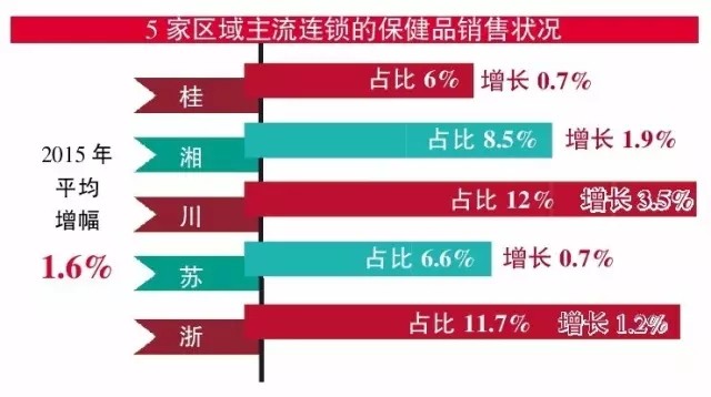 为了进一步了解药店保健品的实际增长情况,记者随机采访了广西、湖南、四川、江苏、浙江各一家主流连锁企业,其年销售规模在1亿元到7亿元之间,得到他们2015年保健品的销售占比分别为6%、8.5%、12%、6.6%、11.7%,分别比去年同期增长了0.7%、1.9%、3.5%、0.7%、1.2%,平均增幅1.6%。