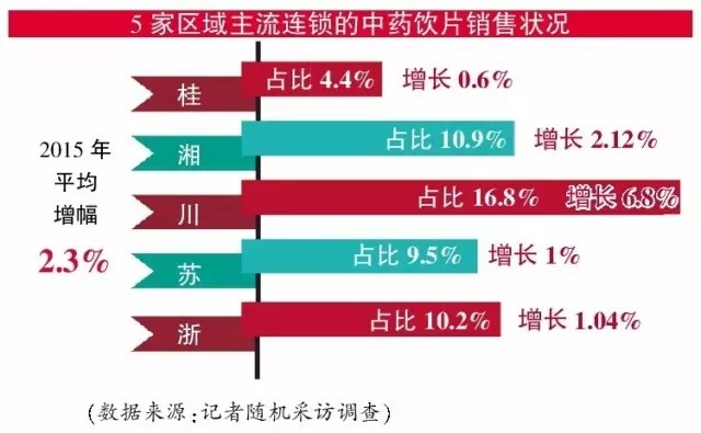 记者在采访中还了解到,在非药品类中,中药饮片和保健品已经并列成为药店的两大销售支柱之一。仍以上述省份几家主流连锁的数据为例,2015年其中药饮片的销售占比分别为4.4%、10.9%、16.8%、9.5%、10.2%,分别比去年同期增长了0.6%、2.12%、6.8%、1%、1.04%,平均增幅2.3%。