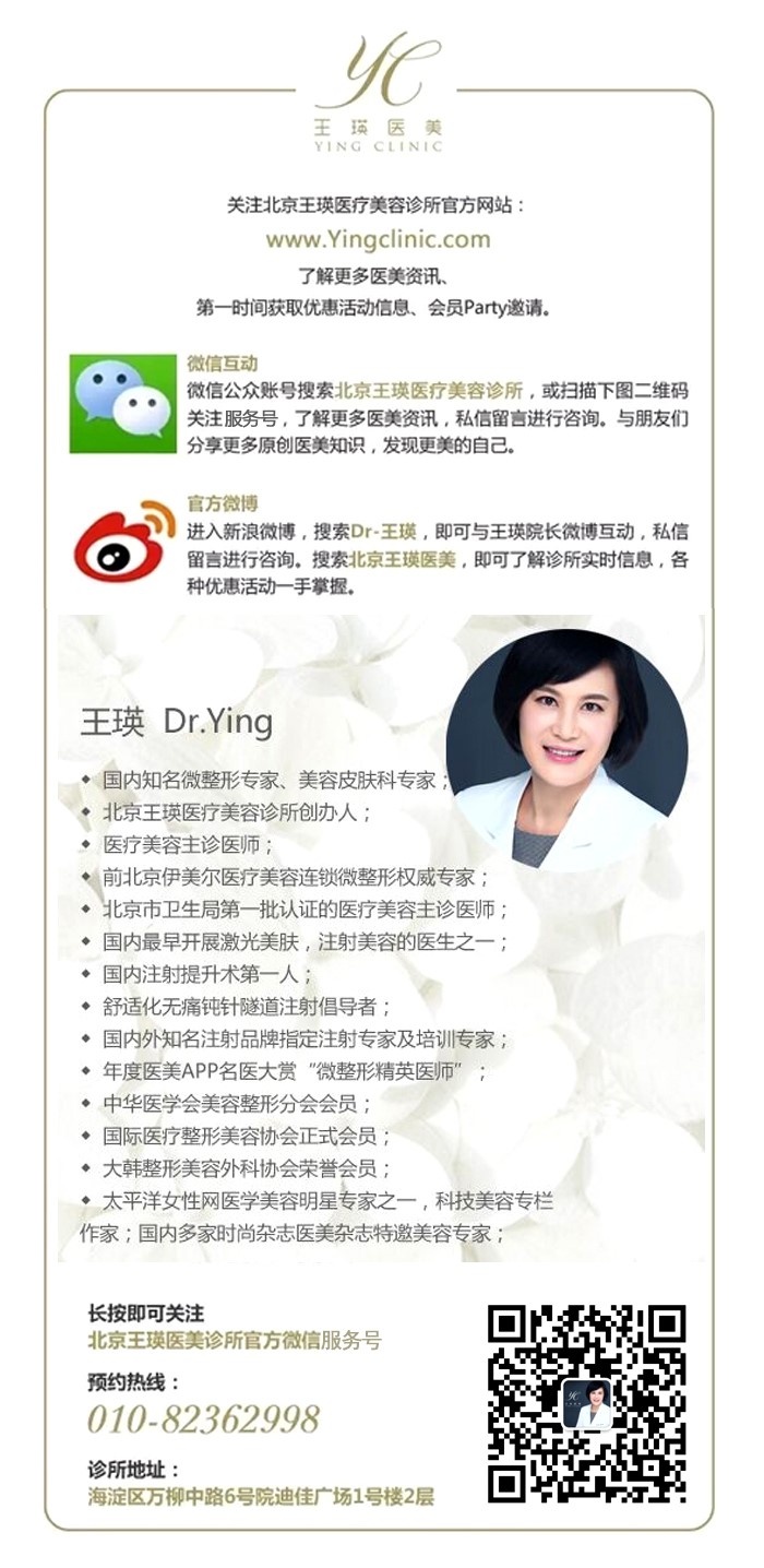 王瑛医疗美容诊所是由国内注射美容专家王瑛医生开创的专家亲诊式、一站式定制化医学美容机构,专注于注射微整形美容技术、激光美肤治疗、问题皮肤管理、居家药妆搭配等。