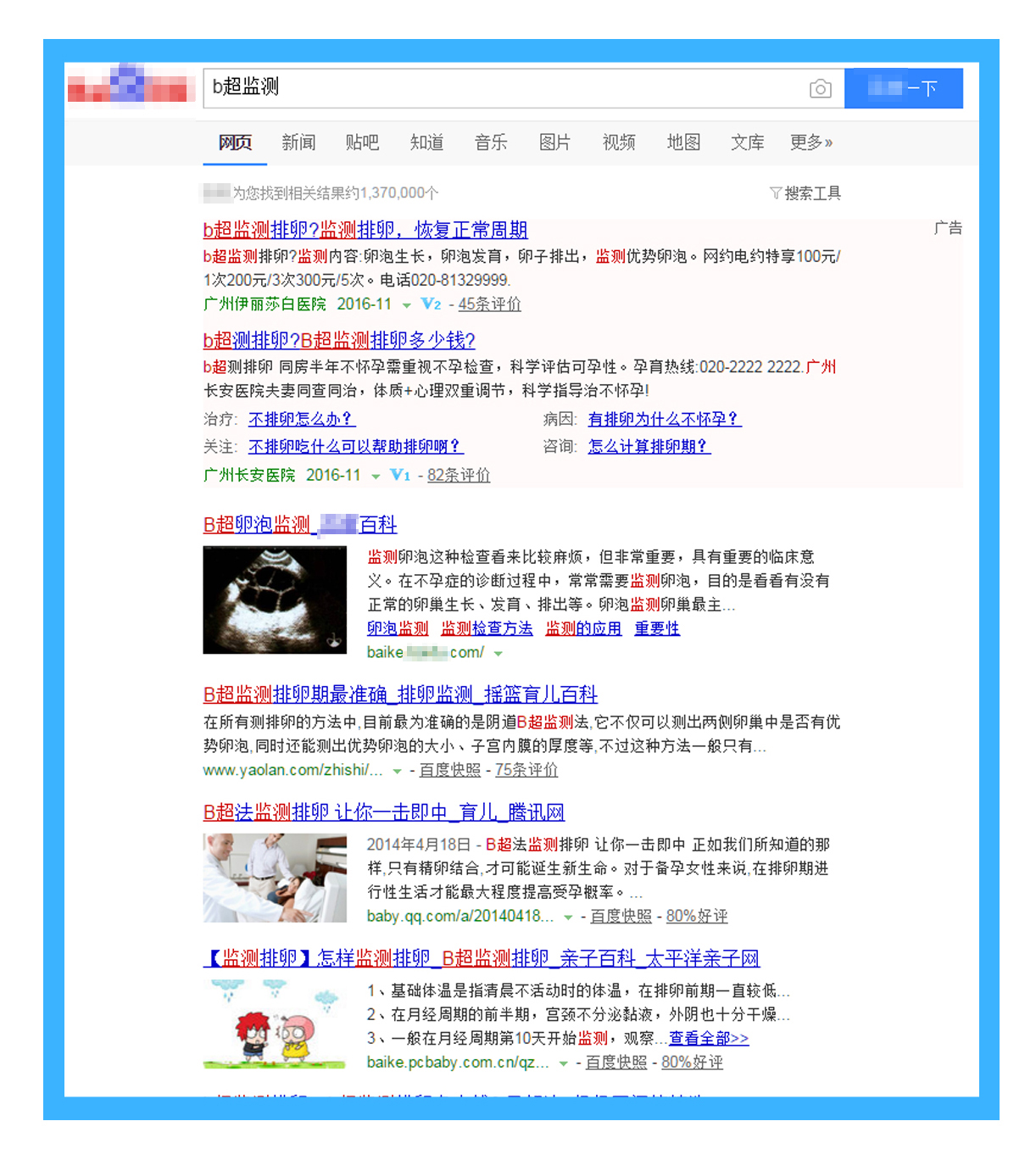 在内容测试方面,在某巨头搜索引擎上查找“b超监测”关键词,首页结果包括商业推广、百科、互动问答、育儿经和新闻等,这些内容更适合网民用户去了解;而同样的关键词在天成医搜的首页结果主要为清一色的供应商联系信息,进入后纯文字的页面也是相当的精简,主要是针对行业用户的结果。因此,两类搜索引擎的结果还是有相当大的差异化。