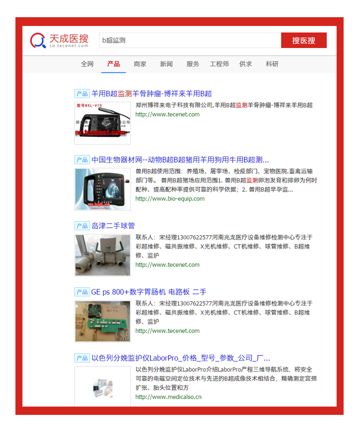 据了解,天成医搜的模式是为医疗机构、商家、工程师等行业用户提供搜索,其结果包括医疗器械产品、供应采购、技术服务、科研、推广等信息,数据来源于天成医疗网内及全网获的认证或审核的内容,并且根据搜索质量和可靠性以及关键词的匹配度排名。