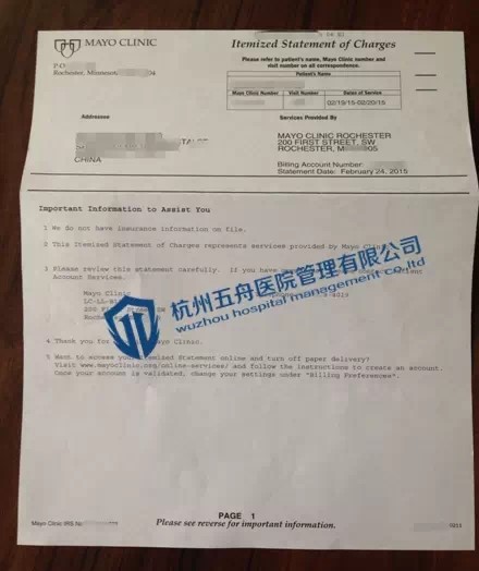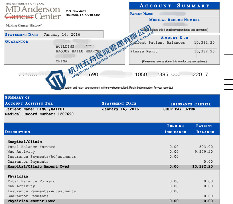 杭州五舟客户在MD安德森癌症中心的治疗账单