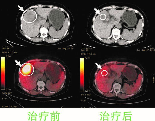 女性,58岁,胆囊癌,伴随腹腔淋巴结多处转移。左两图为A45肿瘤治疗前的CT、PET-CT图像,右两图为治疗后图像,治疗后18F-FDG代谢迅速恢复到正常水平,原发病灶和转移病灶快速缩小。