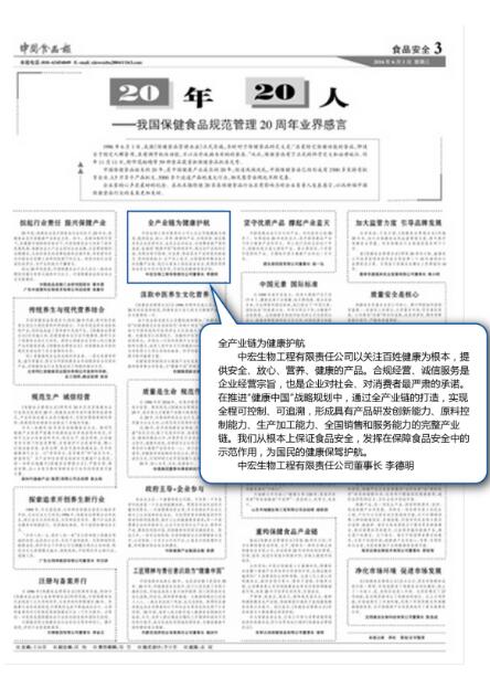 在纪念《办法》实施20周年的“20年20人”致辞中,李总表示:“中宏生物工程有限责任公司以关注百姓健康为根本,提供安全、放心、营养、健康的产品。我们从根本上保证食品安全,发挥在保障食品安全中的示范作用,为国民的健康保驾护航。”