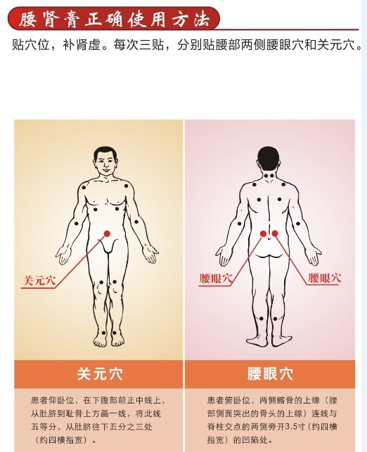 对于肾阳虚引起的腰酸腰痛、肌肉酸痛,夜尿频繁等症患者来说,通过按摩很难快速缓解症状,可以在腰眼穴和关元穴上敷贴腰肾膏来治疗。德众腰肾膏由肉苁蓉、熟地黄、补骨脂、淫羊藿、枸杞子等27味中药精心配伍而成,并创新采用外敷穴位给药的方法,将其贴在腰眼穴和关元穴上,使药物成分不断通过皮肤、毛孔,作用于肾脏,能更好的发挥其温肾助阳、强筋壮骨的作用,有效缓解肾虚引起的腰酸腰痛、夜尿频等症状。