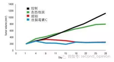 图:患者的个体化肿瘤移植模型药物筛选结果显示,抗癌药物丝裂霉素和顺铂有很好的疗效。 基于个体化肿瘤移植模型药物筛选,患者接受了三个周期的丝裂霉素治疗。 22个月后,患者再次接受两周期的丝裂霉素和三个周期的顺铂治疗。该患者的肿瘤处于缓解期超过5年,至今仍生存。而一般转移性胰腺癌患者生存大约是六到八个月。