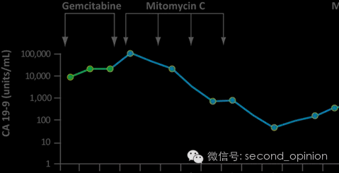患者使用丝裂霉素+顺铂二联用药, CA-199水平重新恢复正常, 并保持超过5年。