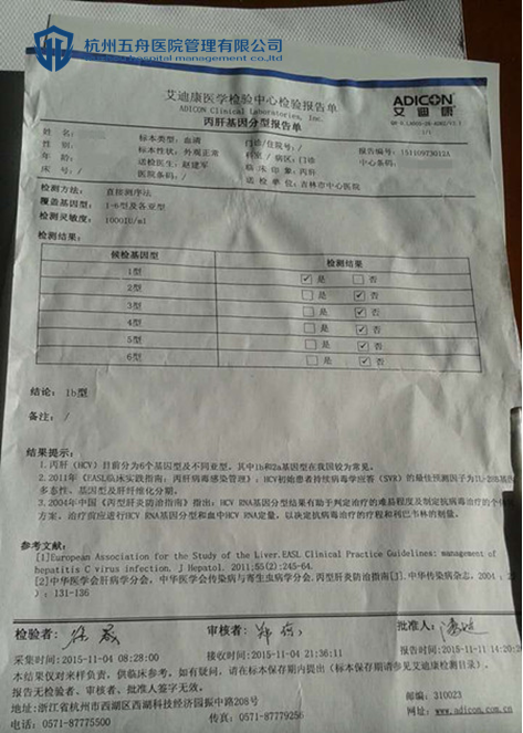 丁女士最后选择第三种方式,经朋友介绍2015年12月14日电话联系了出国就医服务机构杭州五舟,当时是杭州五舟蒋医生接的电话,蒋医生询问了丁女士丙肝基因分型,病毒量的指标,以及肝脏功能情况。丁女士一一告诉了蒋医生,经过杭州五舟蒋医生初步判断,丁女士可以服用吉二代,不过还是需要看过丁女士的检查报告。最后丁女士和蒋医生经过沟通,确定12月17日,丁女士带着病历资料到杭州五舟面谈。
