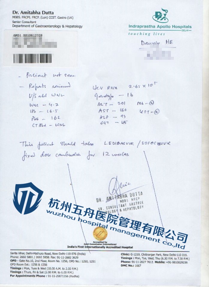 杭州五舟可以为客户购买印度已经上市、印度正规医院、开具正规处方的丙肝药物(索非布韦、达卡他韦和吉二代),杭州五舟会先安排患者在自己家中进行印度医院专家视频会诊,会诊后工作人员会将药物及医院处方等以快递的方式寄到客户家中,客户可以足不出户就能买到安全放心的丙肝药物(索非布韦、达卡他韦和吉二代)。杭州五舟电话(400-150-8089)