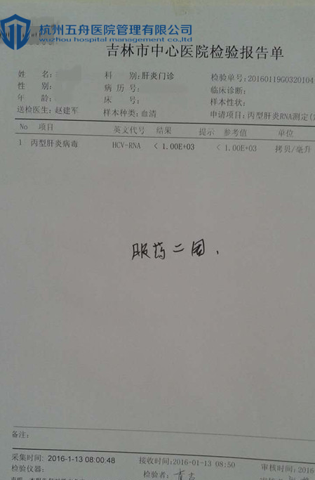 12月29日,丁女士拿到了吉二代和处方。12月30日开始服用药物,连续服用两周后,丁女士去医院做血常规和病毒量的检查,发现病毒量已经小于10的3次方。