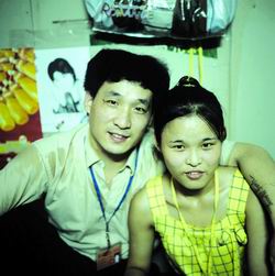 一对年轻夫妻在镜头前合影。同样的打工经历、共同的命运安排使得不少男女在工厂里相知,然后相伴。