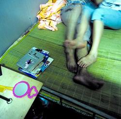 中午12点,周平志夫妇在食堂吃过午饭,回到顶楼的七平方米宿舍。这个小小的空间,是他和妻子每日结束辛苦打工后的私密爱巢。他一屁股坐在床上,妻子从公共水房打了桶水,为他擦洗膀子,不到一小时又要开工了,他们得抓紧时间休息。两个人从江西到广东打工五年了,几乎每年换一家厂,如今在这家已经呆了两年,因为厂里为同在一厂上班的夫妻分配了“夫妻房”。