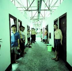 “夫妻房”设在顶楼上,6楼以下都是集体宿舍,男女分开,每间住8至10人。6楼是厂里单独建的,分成4排建了68间面积一样的小房间,房间之间用木板隔着,不够隔音但都是单门独户。房间不大,最多五六平方米,陈设简单,一张床、一张小桌子和两个行李袋。也有住的久的夫妻会把房间简单“装修”,铺上地板胶,放一部收音机和电视,晚上下班三五老乡聚在一起看看电视、打打牌算为消遣。夜里10点到12点间,“夫妻房”宿舍区人气最旺。加班回来的工人开始洗漱,一时间6楼走道、水房、卫生间到处都有男男女女的说笑声,像一个大杂院。