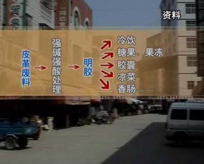 而这种绝不能入口的工业明胶却被偷梁换柱,改装包装用在了冷饮、糖果、果冻、胶囊、凉菜、方便面、香肠等食品加工行业中。