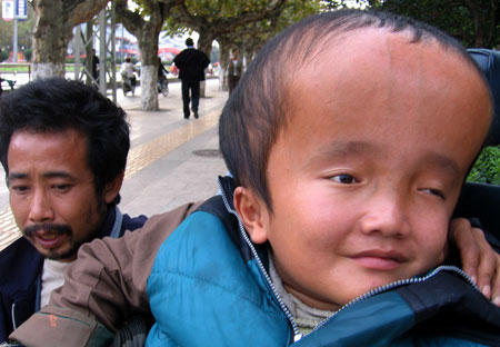 生活新报讯 一个12岁的孩子,脑袋巨大无比,重量居然达到25公斤,超重的头部让孩子根本无法站立。昨日,记者在云南省第一人民医院获悉,一对从湖南来昆寻医的父子,由于孩子患有先天性脑肌损,致使脑袋大如水桶。为了寻找到治疗方法,父亲带着他走遍全国。据了解,这是我省首次发现巨头娃娃。