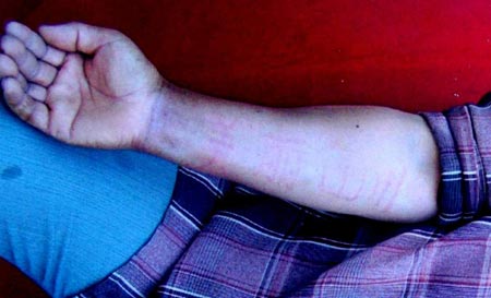 检查:吃药无效仍“长”字 胡玉芳告诉记者,此前,她的身体一直很好,体重在75公斤左右。然而自从这件奇异的事情发生后,由于精神和心理上的压力,她的体重很快减少了20多公斤。8月13日,胡玉芳的家人将其送到兰大一院进行检查。在检查时,胡玉芳的下腹出现“前进”的字样医生用棉签、指甲在其胳膊等处划擦后,初步检查为“人工性荨麻症”,是一种常见的皮肤病,只要用物品刮擦就能出现印痕。检查结束后,医生给胡玉芳开了一些常用药,让先回家服用。不料到了8月14日,胡玉芳的腿部竟然奇迹般地出现“前进、前进、继续前进”的血色字印。当记者结束采访要离开胡玉芳家时,胡玉芳夫妻俩紧紧抓住记者的手,一再恳切地说:“希望有关专家获知此事后能帮助我们查清原因,使全家人早日摆脱这种困扰。”
