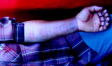 讲述:身上奇迹般“长”字 胡玉芳说,8月15日晚上9时10分,孩子们发现她的身上又开始“长”字了,左胳膊上出现“前程似锦”,右胳膊上为“万象更新”,肚子上还有“+中华+”的字样。大约晚上10时许,左腿出现“左龙”,右腿出现“右虎”几个字。起先,这些字有明显的肉痕,并且微微凸出,后来慢慢变成血色状。到8月16日早上起床后,这些“长”出来的字就都消褪了。胡玉芳的丈夫杨宗堂说,平常“长”出的字多为楷体,但15日晚上“长”出来的字却为草体,而且看上去很显眼。