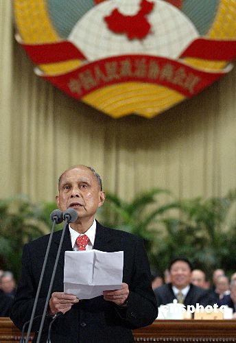 资料图片:二00五年三月九日,全国政协十届三次会议第三次全体大会在北京举行。全国政协副主席霍英东主持大会。 中新社发 廖文静 摄