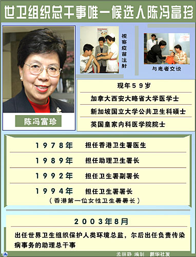 原世卫组织助理总干事、香港特别行政区前卫生署署长陈冯富珍现年59岁,是加拿大西安大略省大学医学学士、新加坡国立大学公共卫生硕士以及英国皇家内科医学院院士。她1994年担任香港卫生署署长,成为香港第一位女性卫生署署长。2003年,她接受邀请,赴世界卫生组织工作。作为世卫组织负责传染病防控事务的助理总干事,她的工作业绩受到许多国家的称赞。
