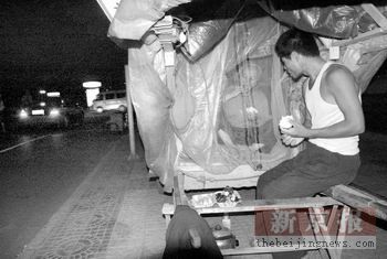昨晚8时,在南礼士路地铁口往南百米处,一辆两轮板车停在人行道上,板车上搭有一木头房子,木板墙上写着“行程3000里,为救患病妻子”的字样。