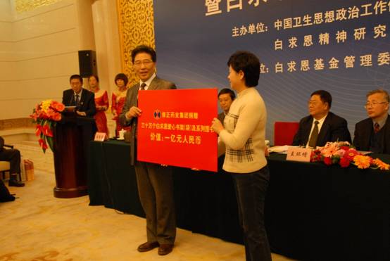 出席会议的有中国卫生思想政治工作促进会、中国健康教育中心、中国卫生思想政治工作促进会白求恩精神研究分会和白求恩工程基金会的领导以及修正药业集团王之光、姜亦浩等高层领导以及新闻媒体等单位代表,共计约150人参加了此次盛会。 大会共分两个议程,座谈会首先由各位领导及部分白求恩奖章获得者进行了积极而热烈的发言,进而对新时期以实际行动践行和弘扬白求恩的伟大精神展开了深入的探讨。 启动仪式正式开始由白求恩基金管理委员会于宗河会长代表及受赠医院代表发言,高度评价了开展白求恩爱心书苑赠送活动的意义。修正药业集团总裁王之光代表爱心企业发表讲话:白求恩爱心书苑的建立,是白求恩精神和修正理念相互融合而产生的一次很大的善举,我们要以实际行动弘扬和践行白求恩精神,捐赠价值一亿元的书架和健康图书,对白求恩爱心书苑的全国推广给予大力的支持,并承诺:“白求恩爱心书苑”建到哪里,我们企业的爱心就送到哪里;白求恩精神传播到哪里,我们企业的脚步就跟随到哪里!讲话完毕,与白求恩爱心工程委员会签订合作协议,并荣获白求恩基金管理委员会授予的 “爱心合作伙伴”称号。 随着揭幕仪式的举行,白求恩爱心书苑这项活动亦正式在全国开始启动。 此次修正药业的慷慨解囊之壮举瞬间在行业内外引起关注。然而事实上近年来,修正药业在公益爱心方面的投入堪称巨大。企业长期以来积极投身公益事业,迄今为止各类直接捐赠已累计超过5亿元。 对于社会公益事业,修正集团董事长修涞贵先生很早就表示:“修正药业会始终保持做药人的良心与爱心,面对祖国出现任何自然灾害、突发事件和社会救助,修正药业都会尽自己的微薄之力,为祖国分忧,为民族贡献自己的微薄之力。” 作为中国特大型制药企业,修正药业多年来秉承“修元正本,造福苍生”的经营理念,始终坚持做药人的良心。在98抗洪、抗击非典及5.12地震、吉林洪灾等危急关头,修正药业挺身而出,不仅发挥了大企业所应承担的社会责任,而且在紧急时刻积极行动,尽企业所能帮助需要帮助群众重建信心,抚平受伤心灵。十几年来,修正药业积极投身慈善事业,累计共捐款捐物5亿元。修正药业董事长修涞贵被授予“中国最具社会责任感企业家”,修正集团更是被冠以“中国公益慈善明星企业”的称号。 此次,修正药业通过对白求恩爱心书苑的捐赠,来传递白求恩精神和修正理念,起到引领和表率的作用,凝聚更多更大的人道和爱心力量,去救助那些需要帮助的人们、挽救那些需要永续的精神!将中华民族富有爱心的传统美德传承下去并发扬光大。