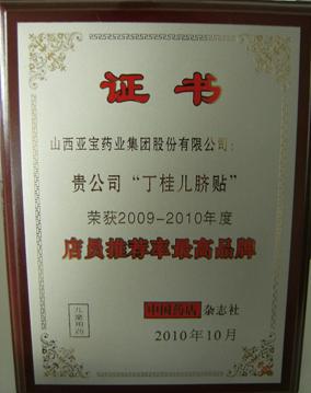 前不久,亚宝“丁桂儿脐贴”再次荣膺《中国药店2009年—2010年“店员推荐率最高品牌”》。作为儿童用药的冠军品牌,“丁桂儿脐贴”可称之为该奖项的“常客”,去年丁桂儿脐贴就曾获得2008-2009年度儿童止泻类药的“店员推荐率最高品牌”。而这些荣誉正是对亚宝“丁桂儿脐贴”产品品质的最佳肯定。
