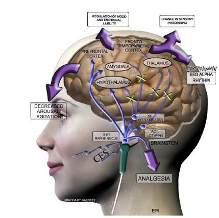治疗时候,苏瑞的耳垂上夹着两个小电极,200微安的电流通过电极线,并从颞部向大脑边缘辐射。苏瑞开始感到放松,面部肌肉得到舒展。霍普金斯医生问她感觉如何。“我真的很开心”,她非常惊奇并回答说,“我感觉可以起来做任何事了。”比她的话语更生动的回答是她喜悦的神情。