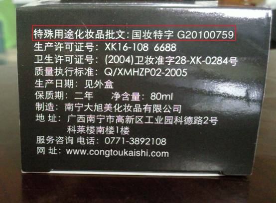 根据国家规定,防脱、祛斑、丰胸、防晒等化妆品属于特殊用品化妆品,以从头开始的毛博仕防脱育发液为例,其特殊用途化妆品批文是“国妆特字G20100759”(2008年9月1日前通过审批的批准文号是“卫妆特字”,之后通过审批的文号是“国妆特字”,有效期为4年。)此编号是可以从国家食品药品监督管理局的网站上查询到的。