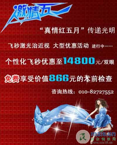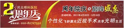 北京民众眼科医院为回馈广大市民对我院的支持和厚爱,特由民众眼科医院推出“迎院庆·送光明”飞秒激光治近视大型优惠活动!具体活动内容如下: