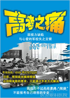 北京民众眼科专家提醒您,高考院校有很多专业对考生的视力有严格的要求,孩子想报考自己喜爱的军事院校专业,就必须摘掉眼镜,而目前,想彻底地摘掉眼镜,达到眼体检的要求,只能通过激光近视手术方式解决。关注考生的视力健康就是关注他们的未来!北京民众眼科医院让我们与殷殷心切的父母们一道,帮助孩子闯过人生第一关!