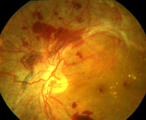 糖尿病视网膜病变分为六个时期I 有微动脉瘤或有小出血点,(+)较少 易数 ( ++)较多,不易数