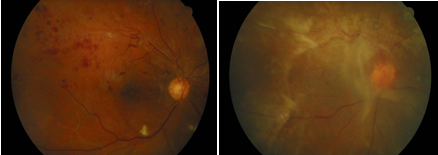 早期视网膜后极部散在微血管瘤和小点状或小片状出血,视网膜静脉充盈扩张、轻度纡曲。随着病情的发展,除了微血管瘤和点、片状出血外,同时出现白色或黄白色渗出,病变往往波及黄斑区影响视力。