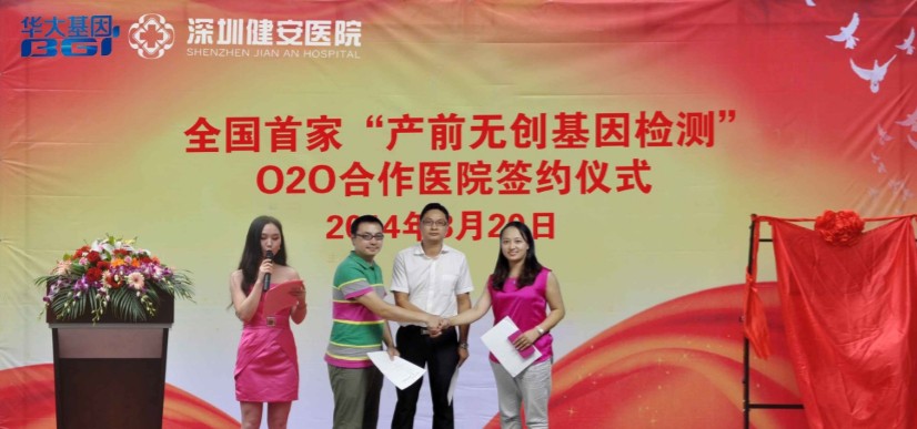 2014年8月20日华大基因与深圳健安医院签署《胎儿21-三体综合征无创基因检测合作协议》,双方携手推动无创产前基因检测“O2O”新模式,孕妈妈可以网上预约,线下检测。这标志着华大基因开启向O2O平台合作发展的步伐。