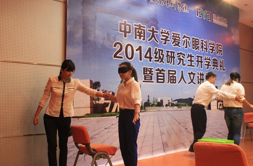 体验失明,关爱失明儿童。在9月30日的中南大学爱尔眼科学院2014级研究生开学典礼上, 31名新生体验了几十分钟的失明世界。戴上眼罩,上、下楼,跨越各种障碍物,失去光明之后去完成平常生活中一件再简单不过的事,都会变得极其困难,要花费比平常多数倍的时间,同时,来自于心理方面的无助、恐惧也会极大地阻碍行动。这仅仅是一次模拟,很快,参与模拟失明实验的学生就取下眼罩,回归正常生活。