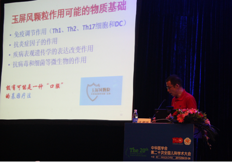 大会围绕主讲人中国中西医结合学会儿科专业委员会常委沈朝斌教授的重要研究课题——“玉屏风颗粒MicroRNA谱特质基础研究及临床免疫调节作用”的最新成果报告展开。沈教授指出该研究课题,在国内为首次从基因学说出发,完整解析玉屏风颗粒MicroRNA谱特征,还详细分析了玉屏风颗粒作用的物质基础,包括:免疫调节作用(Th1/Th2/Th17细胞和DC)、抗炎症因子的作用、疾病表现遗传学的表达改变作用、抗病毒的细菌等微生物的作用,并提出玉屏风颗粒“极有可能是一种口服的基因疗法”的重要观点。此次研究开启了玉屏风颗粒在基因研究领域里的新篇章,也开启了儿童用药安全的新篇章。