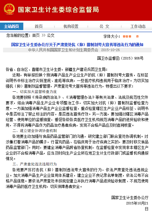 2015年10月26日国家卫计委通过调查核实,要求各级单位严肃查处抗(抑)菌制剂非法用途,这对于合法合规企业来讲,是一件振奋人心的事。对于规范医药市场环境、进一步净化中国医疗服务大环境。