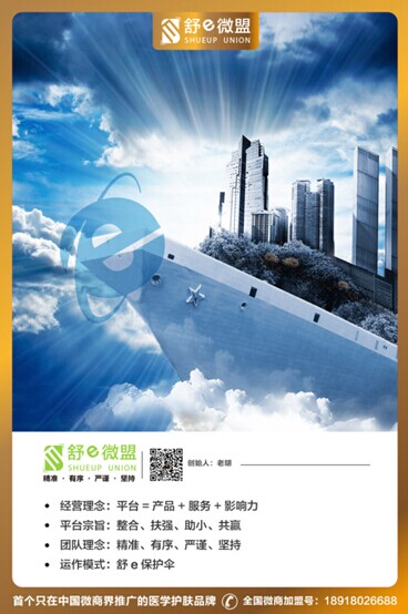 宣发给力,综合运营的水准将成为每一个加入“凤翔伊美”团队的人都应该引以为傲的。这就是因为“凤翔传媒”与国内著名微商经济独立运营平台“舒e微盟”深入合作,“舒e微盟”将凭借自己独特的运营模式“舒e保护伞”来完成整个产品的运营。这里值得一提的是,“舒e保护伞”是“舒e微盟”所特有的运营模式,这种运营模式以“整合、扶强、助小、共赢”的经营理念,是一种“天才般的模式”,只有团队整体的发展是真的发展,“保护伞”扶持着整个营销链最需要保护的广大微小代理环节,这一举动一直以来都是深得人心,推动大代理的运营,扶持小代理的生命力;协助大代理更好的开拓市场,管理团队,让小代理有平台依靠,有坚实的后盾,为实现“可持续性的整体性增长”而不惜一切努力,这就是“舒e保护伞”的最大特点。