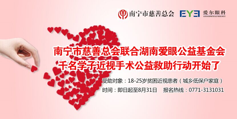 如果您深受近视困扰,影响了学业或就业,却因家庭贫困而得不到救治。好消息来了,湖南爱眼公益基金会向南宁市慈善总会捐赠100万元,进行为期三年的近视手术援助,第一期活动计划今年内对20名贫困近视患者免费实施近视手术(60名飞秒激光近视手术补助2000元)。