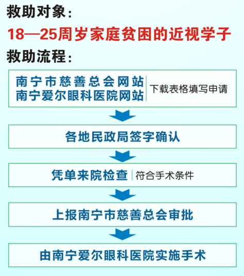 如果您是18-25岁的近视患者,近视问题严重影响学业、就业,或给生活带来极大不便,经民政部门确认的城乡低保户家庭近视患者,即可到南宁慈善总会官网填写报名表,或可凭相关材料直接到南宁爱尔眼科医院进行报名。咨询电话:0771-3131031、咨询QQ:800003395。