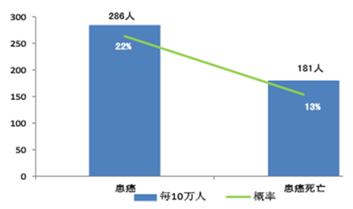在我国,癌症的发病率和死亡率也趋向高发。根据2013年最新统计报告,目前我国癌症发病率为每10万人中就有286人患癌,每一个人一生中有22%的概率罹患癌症。每10万人有181人患癌死亡;一生中有13%的概率患癌死亡。每分钟就有6人被确诊为癌症,平均每5位癌症患者就有3人死亡。第三次全国死因回顾调查揭示残酷现实:中国人癌症死亡率在过去30年增长八成以上。