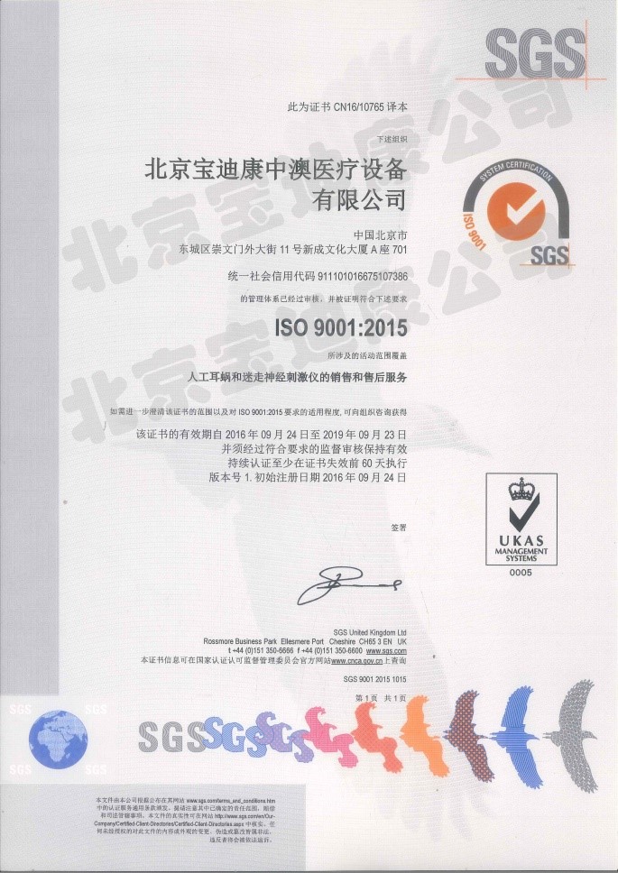 2016年9月, 经过通标标准技术服务有限公司(SGS)系统、深入、全面地审核,北京宝迪康中澳医疗设备有限公司(简称北京宝迪康公司)获得“IS09001:2015"质量管理体系认证证书。“IS09001:2015”是最新的质量管理体系认证标准,据查在人工耳蜗和迷走神经刺激仪的销售和服务领域,北京宝迪康公司是全国首家通过此项标准认证的企业。