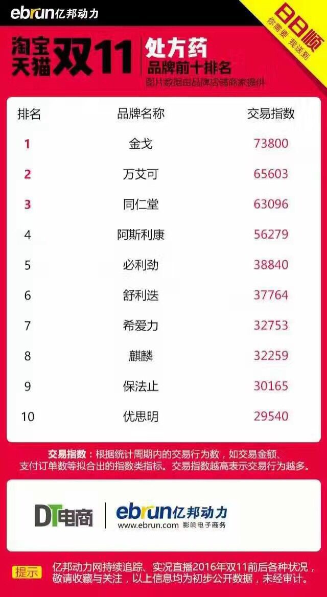 双11已经落下帷幕,在2016淘宝天猫双11处方药品牌前十排行榜中,白云山金戈以7万的交易指数拔得头筹,力压曾经的市场龙头万艾可(原研药)!交易指数是品牌实力的重要依据之一,交易指数指的是根据产品交易过程中的核心指数,订单数、买家数、支付件数、支付率金额等淘宝综合计算得出的数值。数值越大反应交易热度越大,产品越优秀。早在2015年,就有官方数据显示:金戈上市一年,按市场零售价计销售突破7亿元,实际销售数量已超过原研药。