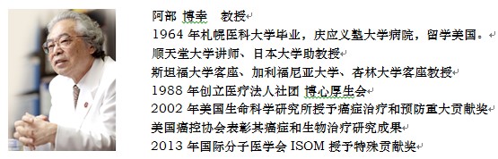 阿部博幸教授是日本细胞免疫治疗的先驱,开创了免疫细胞疗法、免疫阻断疗法、免疫联合疗法,并获得美国日本多项专利。现在,全日本1/4采用免疫细胞疗法的肿瘤专科正在接受阿部教授的指导和技术,为更多的患者提供有希望的治疗。
