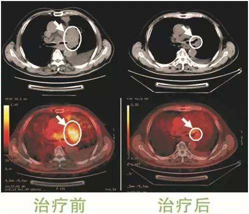 2013年7月诊断为小细胞肺癌,伴纵膈淋巴结多处转移,胸水。因考虑体质不适宜手术切除,服用靶向药物易瑞沙3个月后出现耐药,为寻求更好的治疗方案,找到全球肿瘤医生网,经过多学科专家会诊,制定A45治疗方案。左两图为A45肿瘤治疗前的CT、 PET-CT图像,右两图为治疗后图像,原发病灶和淋巴结转移病灶基本消失,胸水消退,目前患者生活质量良好。
