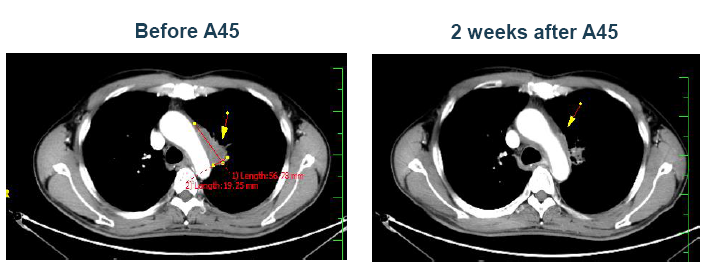 2015年1月确诊为肺腺癌,射频消融术辅助化疗四周期,同年7月,肿瘤复发并出现肾脏转移,经过细胞免疫治疗未见好转。2016年5月,经过A45首席专家会诊,制定治疗方案,患者接受A45治疗一个疗程,肺部的三个病灶全部消退。目前患者状态良好。