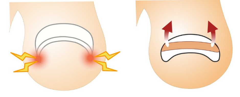 修剪和拔甲改变不了指甲的生长方向,无法根治嵌甲甲沟炎。唯一的解决办法就是通过物理力学原理,改变趾甲生长方向,正甲贴采用柔韧性弹性极强的复合材料制成,贴在趾甲表面后可以产生向上的回弹拉力,改变趾甲形状,改变趾甲的弯曲度,把趾甲逐渐从肉里拉出来,让趾甲侧面一直长到盖过脚趾头的前缘,露出两侧的指甲边角,从而使趾甲不再往肉里长。