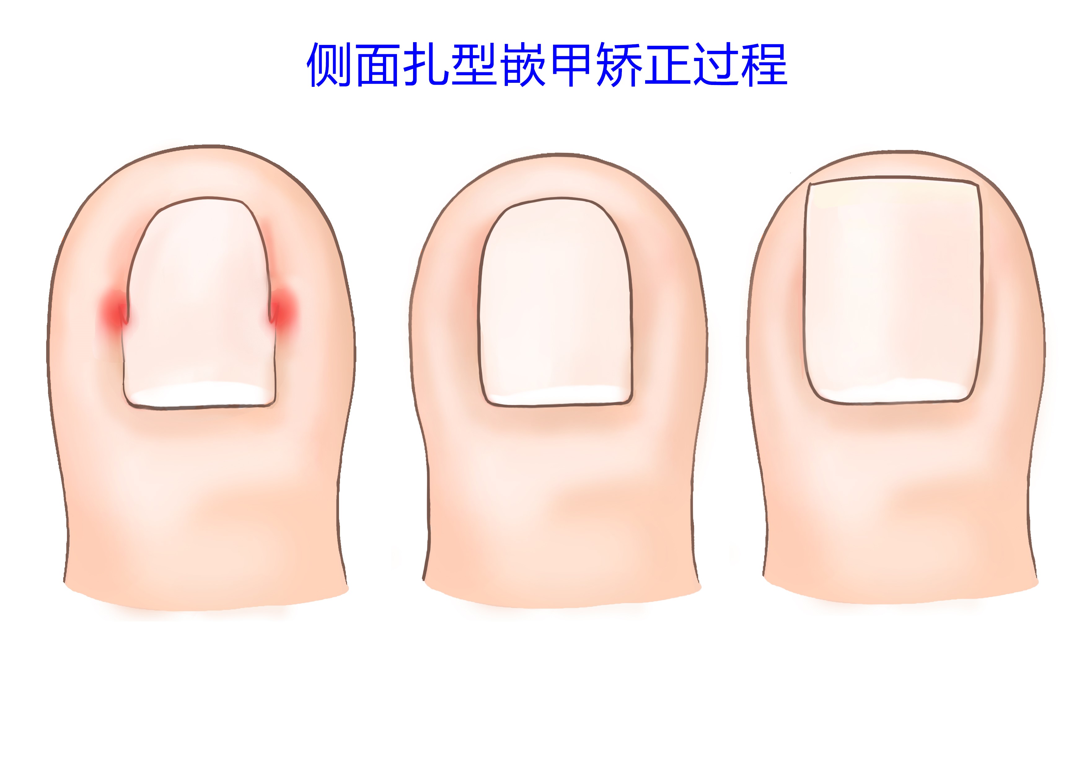 (2)侧面扎入型嵌甲甲沟炎,需要正甲贴把指甲往上抬,把侧面指甲引出来,让指甲一直长到盖过脚指头前缘,这样指甲就不会往肉里长了。